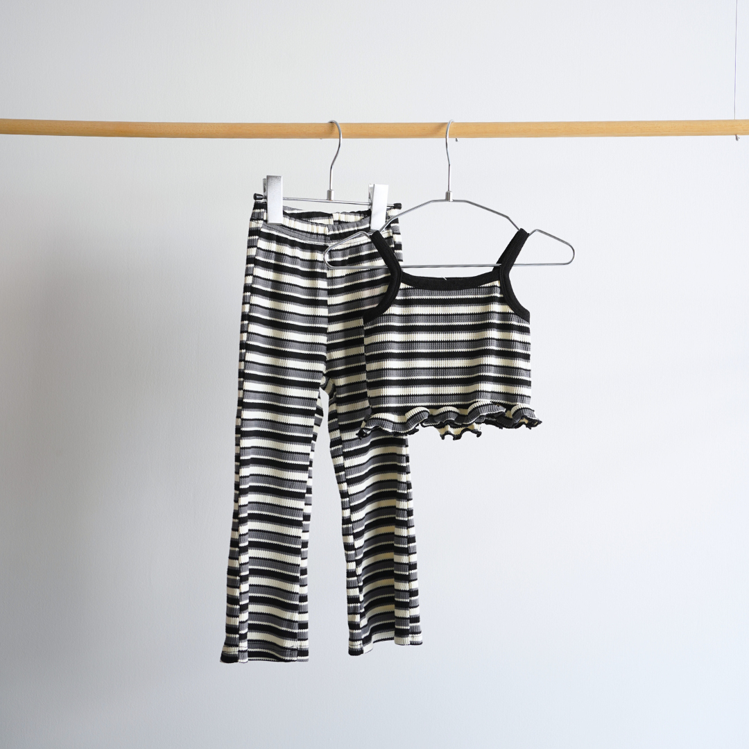 モノトーンで落ち着いた色の組み合わせながら、インパクトのあるボーダー柄パンツ。スウェット合わせや、シャツ合わせ、ちょっと尖ったレザーアイテムとの合わせなど、楽しみ方は♾️色々なコーデでお楽しみください♡こちらはSETUPが可能なアイテムとなっております。ぜひトップスも合わせてご覧くださいね🫶